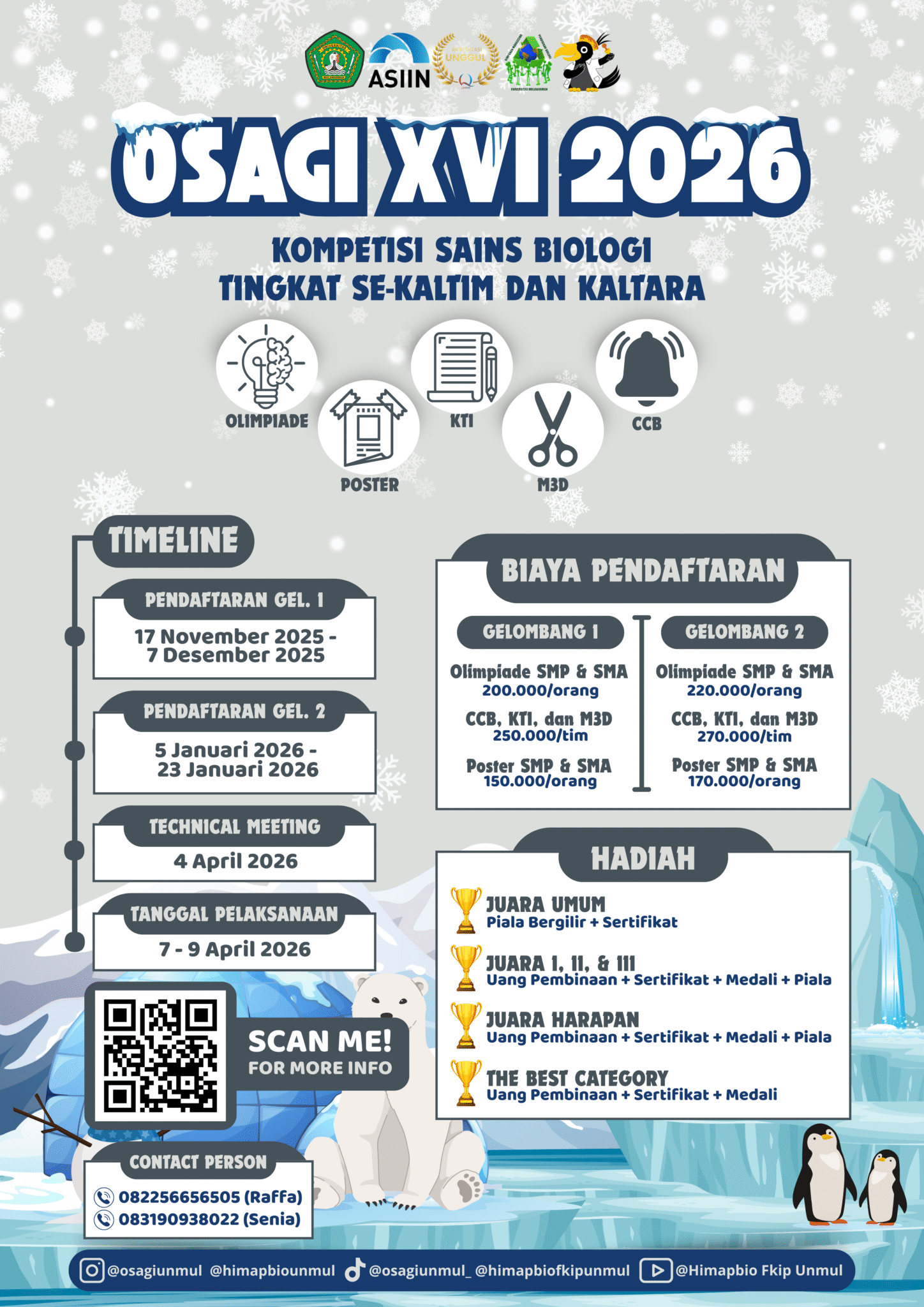 - Pendaftaran peserta Olimpiade, Cerdas Cermat, Mading 3 Dimensi, Karya Tulis Ilmiah, dan Poster, gelombang I dibuka dari tanggal 17 November 2025 sampai 7 Desember 2025 dan gelombang II dibuka dari tanggal 5 Januari 2026 sampai 23 Januari 2026.